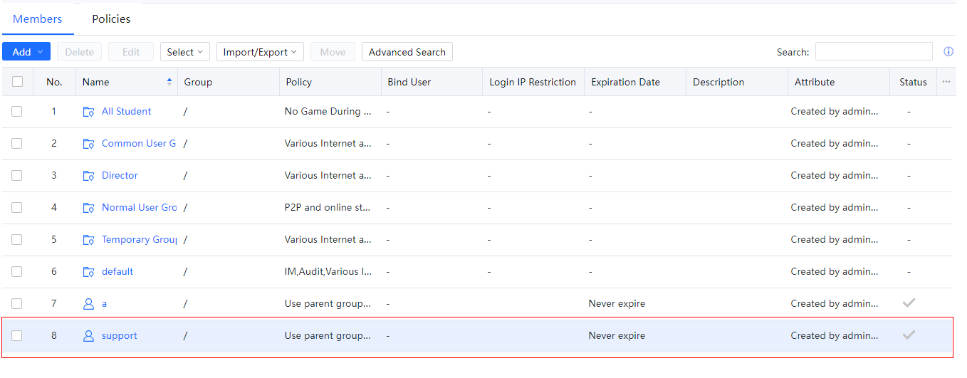 New users are divided into two categories: User and Multiple Users. Since the device has a default policy (password authentication), the administrator can directly add user information and access the Internet through password authentication.