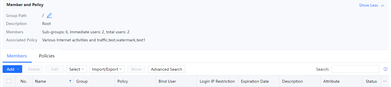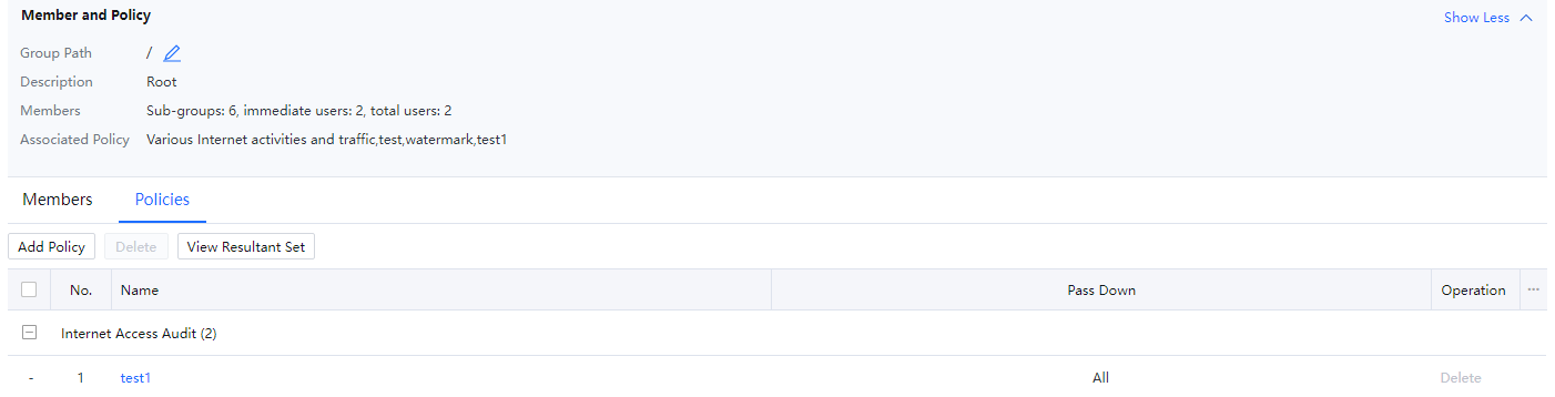 In the Policies, you can view only the name of Internet access policies, and you need to click a policy to view the details. The policy result set provides an easier way for the administrator to view details about Internet access policies referenced by users and user groups. Click View Resultant Set to integrate the policies referenced by a group and list the detailed settings on the Policies tab page.