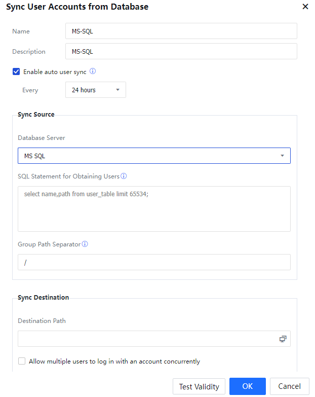 In Database Server, select the database server set in Step 1 and enter the SQL statement to obtain user information and a group path separator. The data table uses the group path separator to separate a group from a child group. In this example, the hyphen (-) is set as the separator. If there are only level-1 groups and no child groups, leave the Group Path Separator parameter blank. In Local Group Path, specify the path for saving the synchronized user information on the IAG.