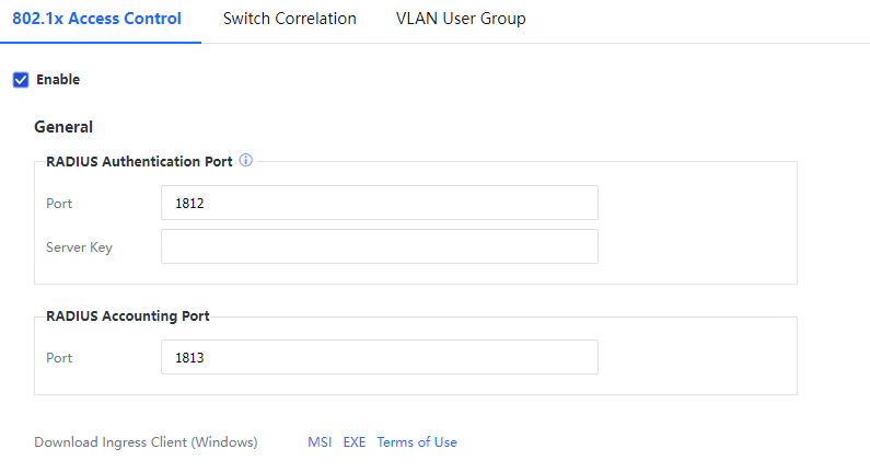 Configure the RADIUS Authentication Port and RADIUS Accounting Port. The authentication port is 1812 by default, the Server Key must be consistent with the key configured on the switch, and the accounting port is 1813 by default.