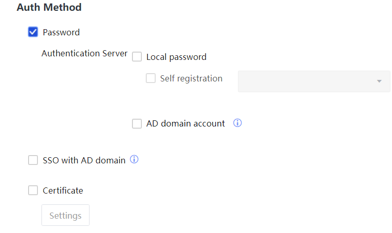 There are two options:l local password and AD domain account. The user source of the local password is the local user that needs to be created in User Management. The source of the AD domain account is the AD domain, and the IAG device needs to join the domain. After the client submits the username and password, the IAG submits it to the AD domain for verification. After the AD domain returns the verification result, the IAG notifies the switch whether to allow access according to the result.