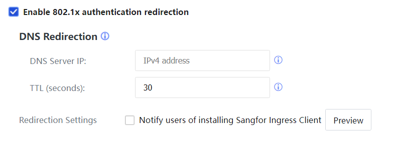 • DNS redirection: Configure the DNS redirection function to implement the redirection function before 802.1X authentication to push the admission client and self-registration functions before authentication.