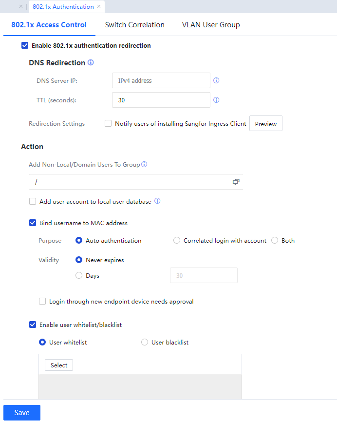802.1x Authentication Bypass: This feature needs to be enabled on the switch at the same time. IAG will divide the bypass users into the bypass VLAN if this feature is enabled.