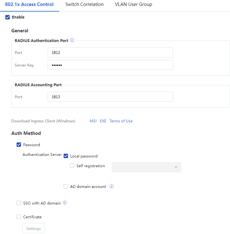Step 1.Enable 802.1x authentication on IAG. Navigate to Access Mgt > Authentication > 802.1x Authentication to configure. Enable the 802.1X network access control function, and configure the Radius authentication port as 1812, the accounting port as 1813, and the server key as 123. The authentication server enables local password authentication.