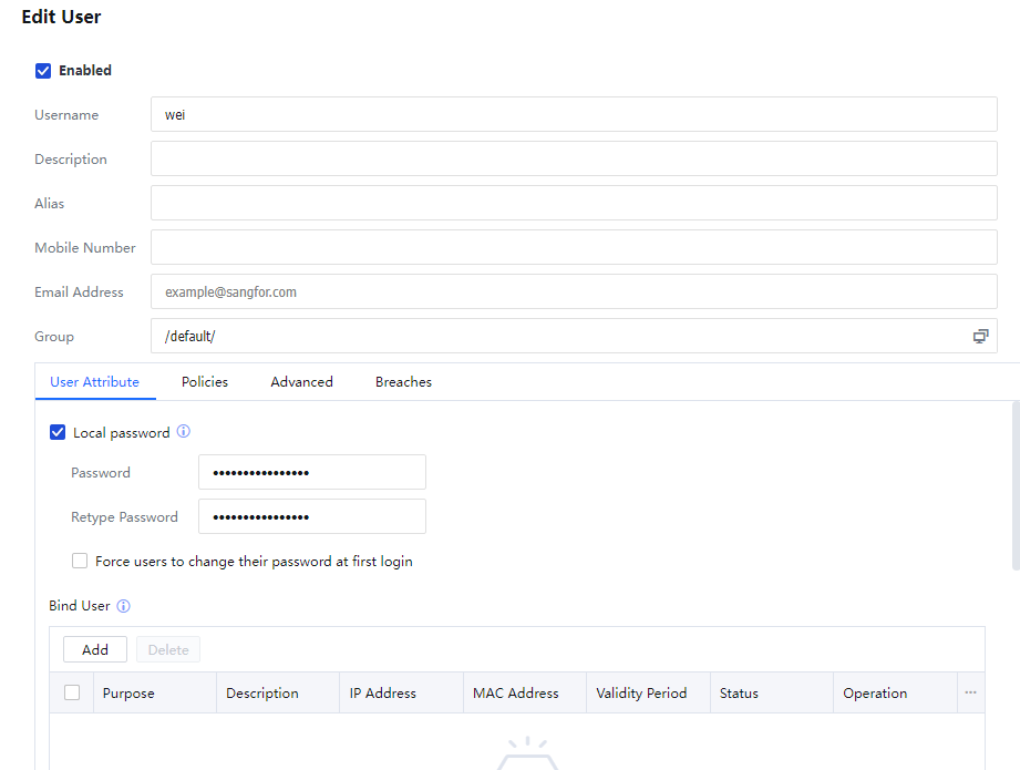 Finally, configure the policy for post-authentication processing, including the group to which the user belongs, whether to bind the user, restrict user login, and other configurations.