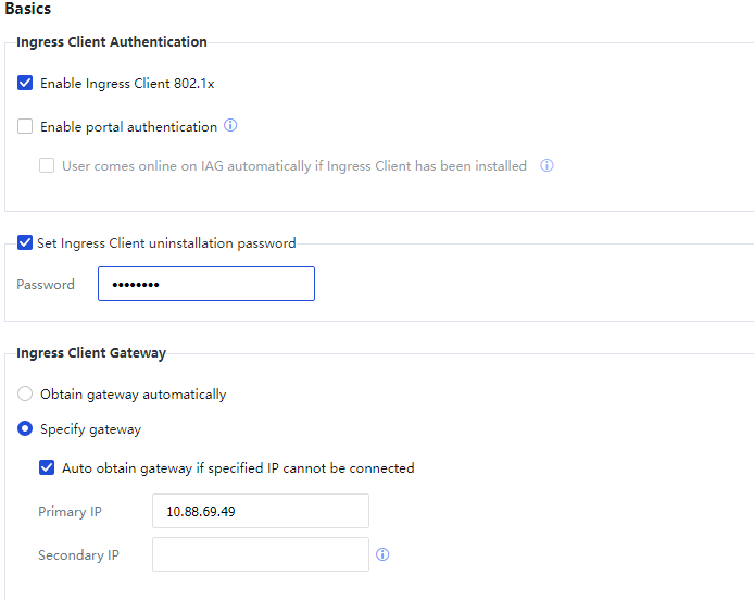 In Access Management > Ingress Client Settings, select Enable Ingress Client 802.1x and Set Ingress Client uninstallation password, and enter the password. Fill in the IAG device IP address in Specify gateway under Ingress Client Gateway address. Under Installation Reminder, select Remind users to install Ingress Client and Allow Internet access. The authentication assistant downloaded after selecting Enable Ingress Client 802.1x in the IAG console will generate an authentication assistant shortcut for entering the account password.