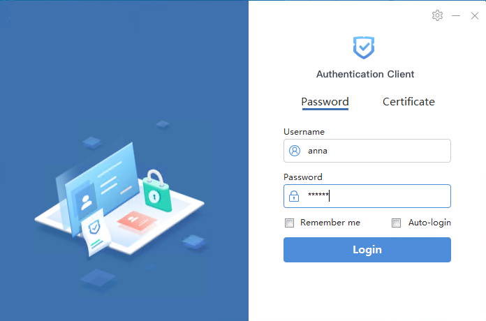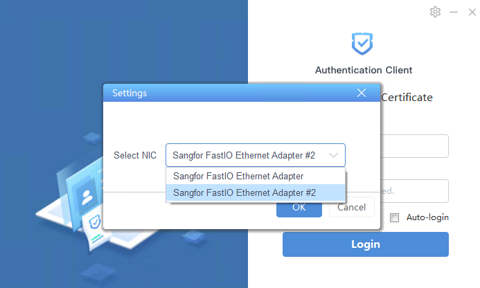 Step 9.When using the Authentication Client, select the correct NIC in the upper right corner and click Login.