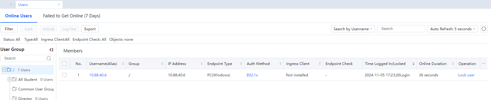 - Navigate to Status > Users, you can see the user's online status, and the authentication method is 802.1x.