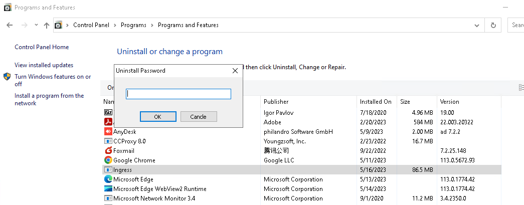 - Select the ingress program in PC Control Panel > Programs > Program and Features > Uninstall or change a program, and click Uninstall. You will be prompted to enter the Uninstall Password. You need to enter the correct uninstallation password (the Ingress client uninstallation password set in the Ingress Client Settings) to uninstall the program. Otherwise, it will prompt "Password incorrect: Uninstallation prohibited".