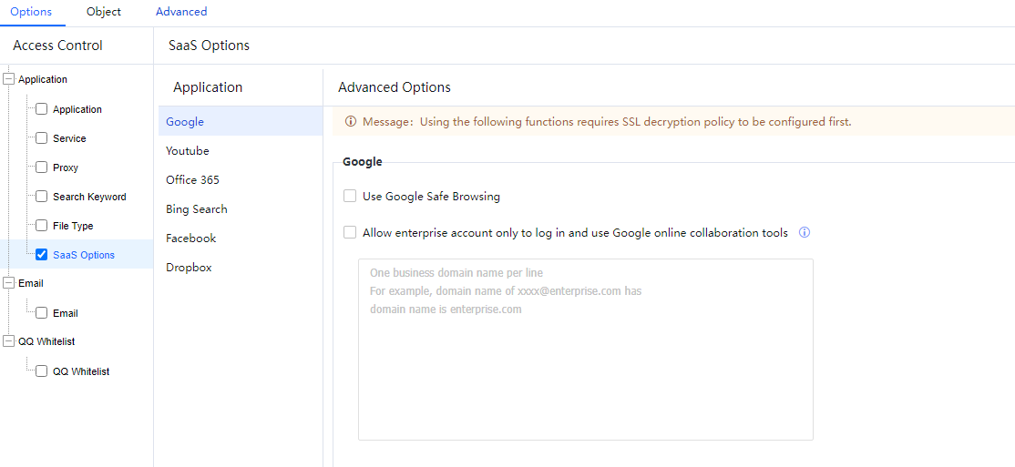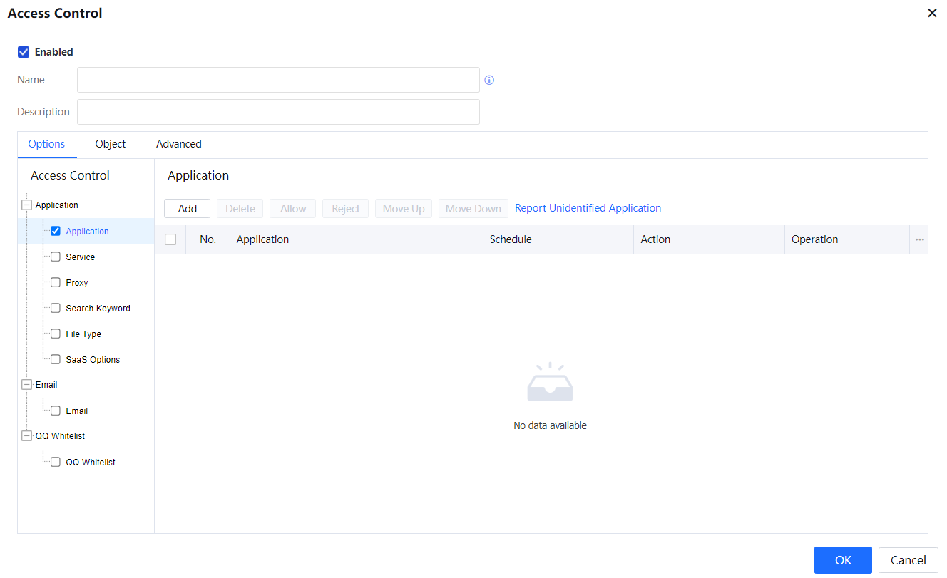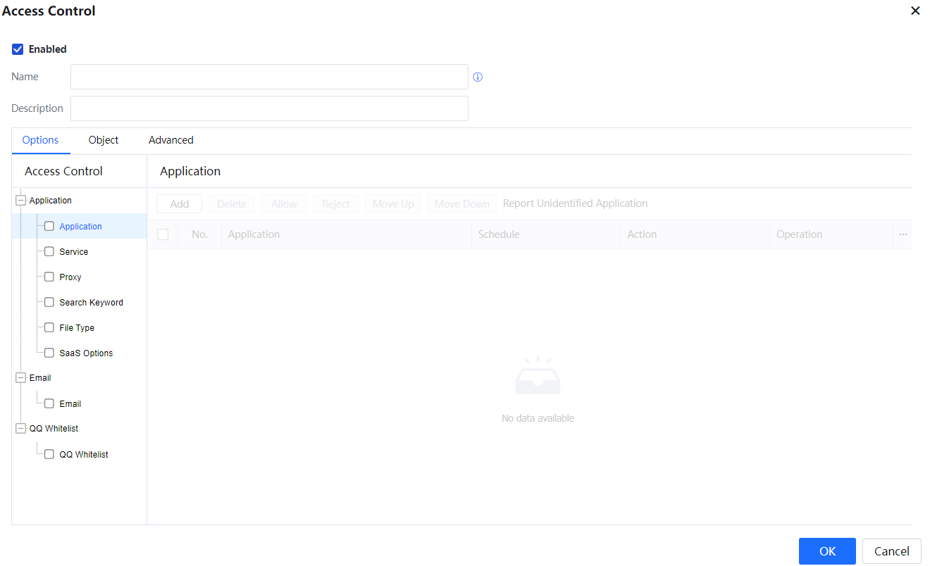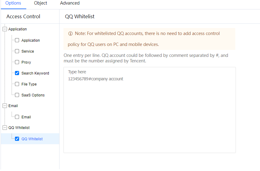 - On the Options tab page, set the Internet access permission policy as required. Select a control type on the Access Control pane and set details on the right pane. Access Control consists of three modules: Application, Email, and QQ Whitelist. For more information, see the following sections.