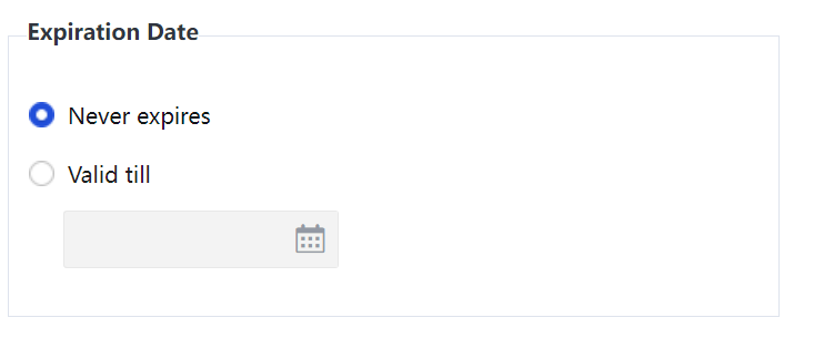 If Never expires is selected, the policy will be valid permanently. If Valid till is selected and a date is set, for example, 2016-06-01, the policy will expire after January 1, 2016.