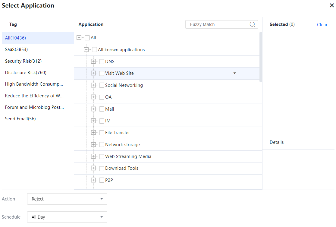- Set Action to Reject, Schedule to All Day, and click OK. The policy for rejecting P2P applications is set successfully.