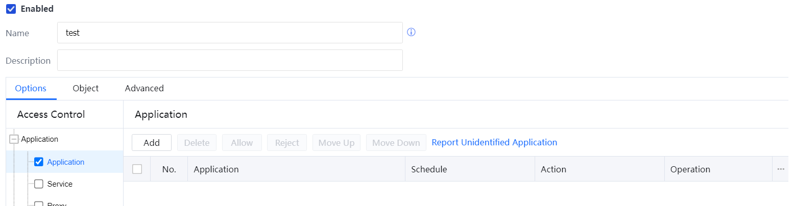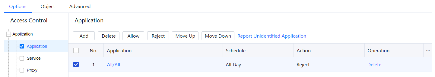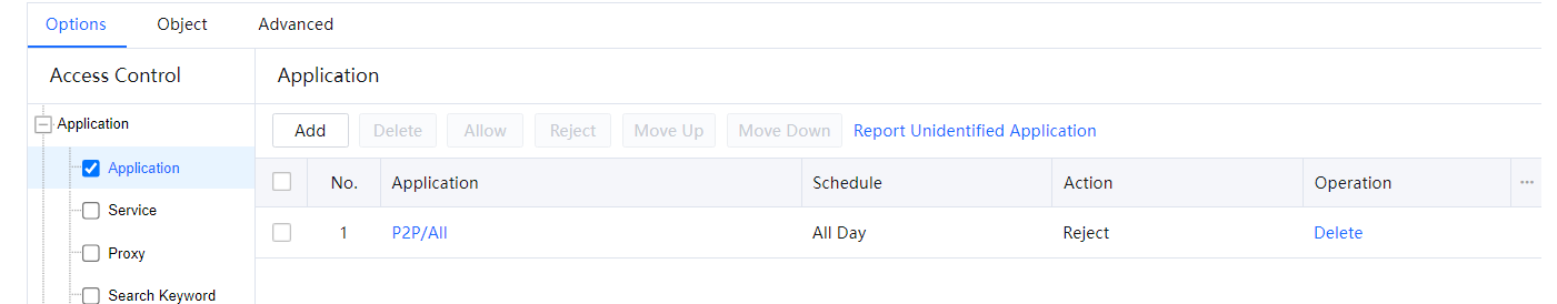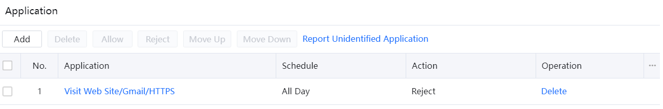 The Application module can detect packet contents to control applications. You need to set control policies for identified and unidentified applications, such as P2P applications, QQ, and mail applications.