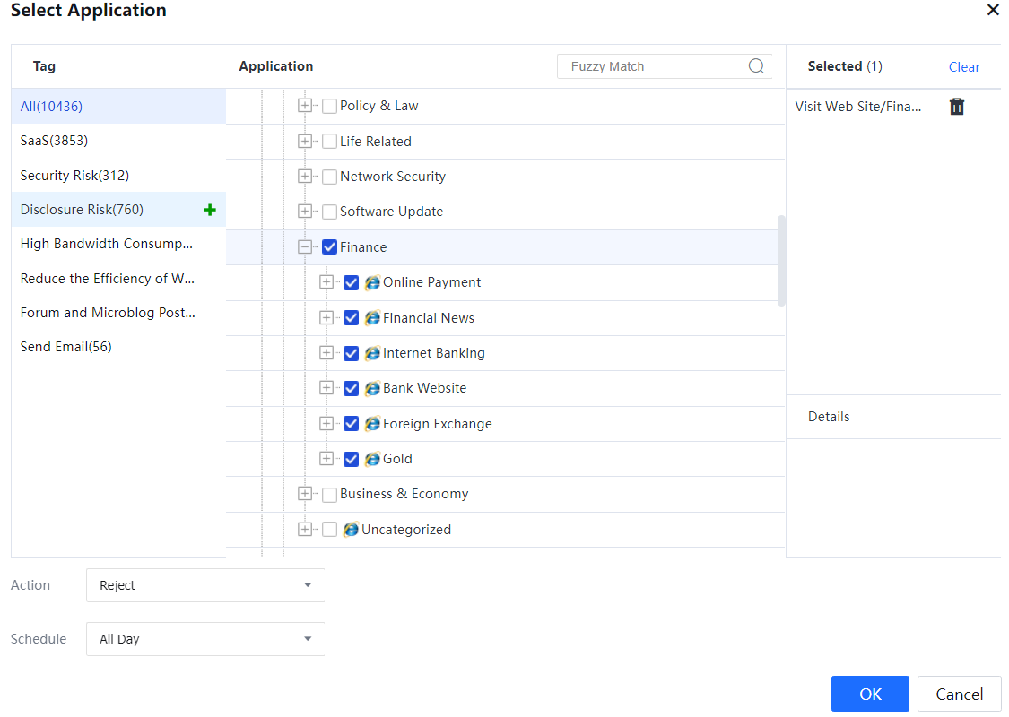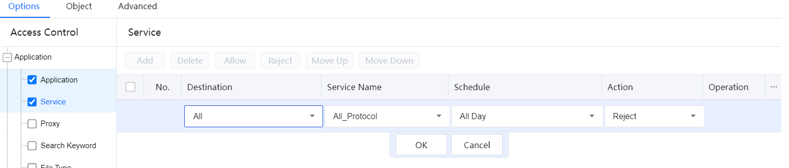 - Set Action to Reject and Schedule to All Day, and click OK. The policy is set successfully.