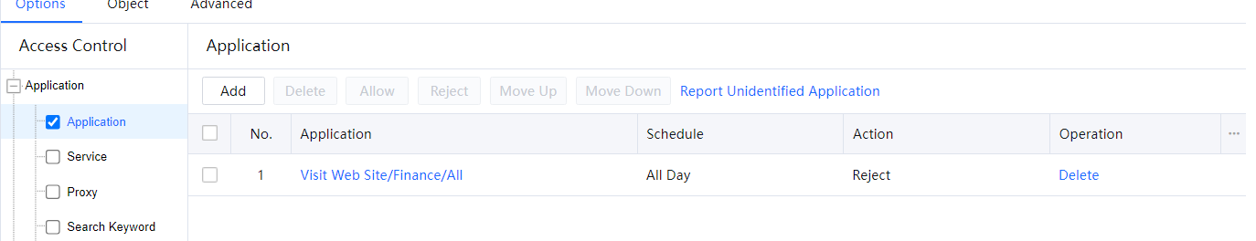 The Application module can also filter website access behaviors, including HTTP URL filtering, HTTPS URL filtering, and HTTP uploading filtering.