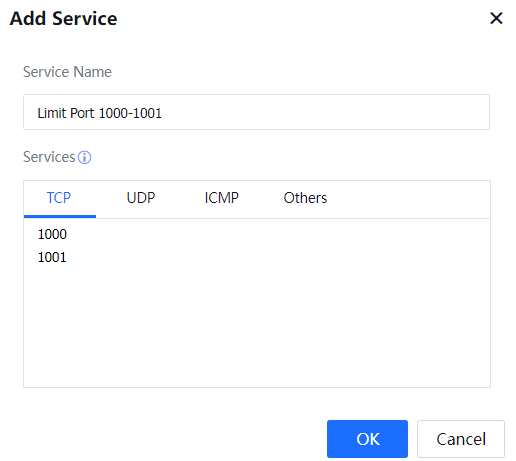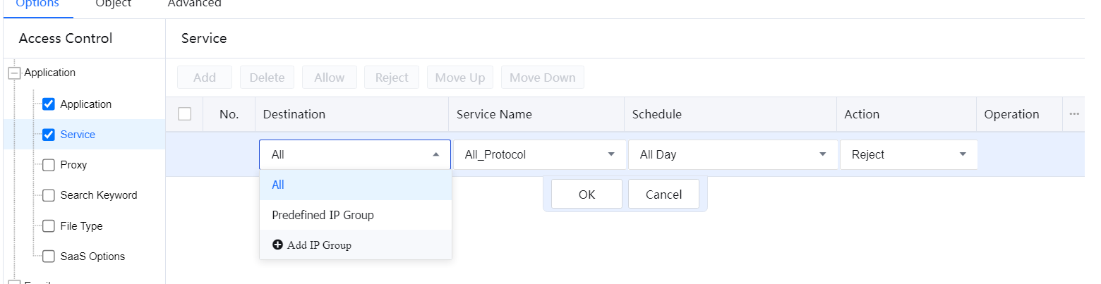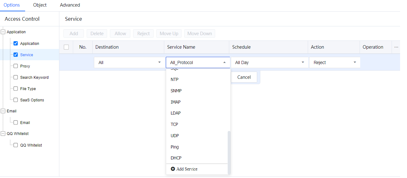 - Select Service. On the Service pane, click Add and set related parameters. It will refer to the IP groups, network services, and schedule groups defined earlier.