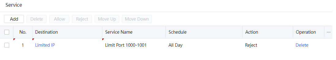 - To modify the port control policy, select the corresponding network service and click Delete to delete the policy. You can also select Allow in Action or select Reject. Click Move Up or Move Down to change the priority of the policy. The policies are matched from top to bottom.