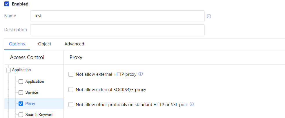 If Not allow external HTTP proxy is selected, the IAG will reject the requests sent by intranet users to access the Internet using an external HTTP proxy server.