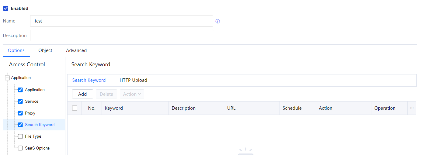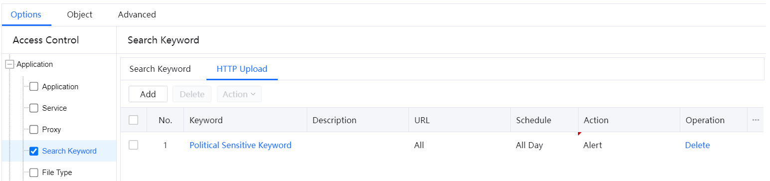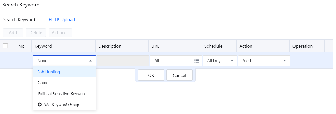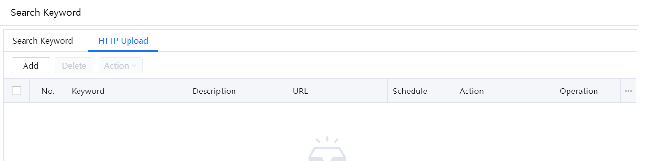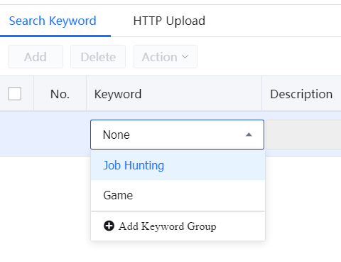- On the HTTP Upload tab page, click Add. Click the drop-down button below Keyword to display the keyword group list.
