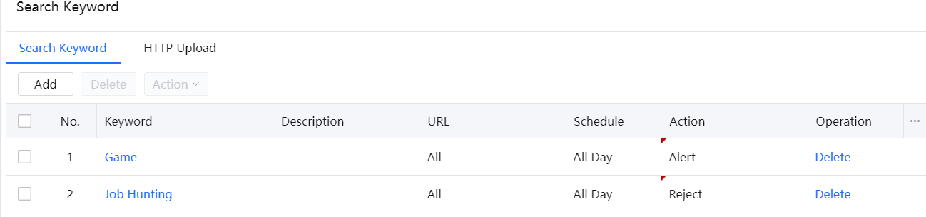 - Set Action to Reject and Schedule to All Day, and click OK. The policy of rejecting search requests for the keyword Job Hunting all day is set successfully. Repeat steps 1 to 4 to set a policy to generate alarms for search requests for the keyword Game.