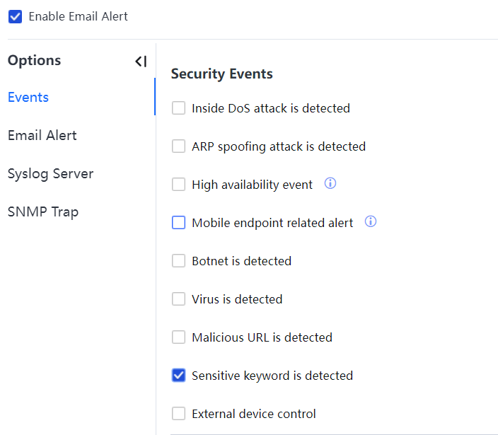 - If only keyword filtering is required, click OK. To enable Web keyword filtering alarms, choose System > General > Alert options > Events > Sensitive Keyword is detected, as shown in the following figure.