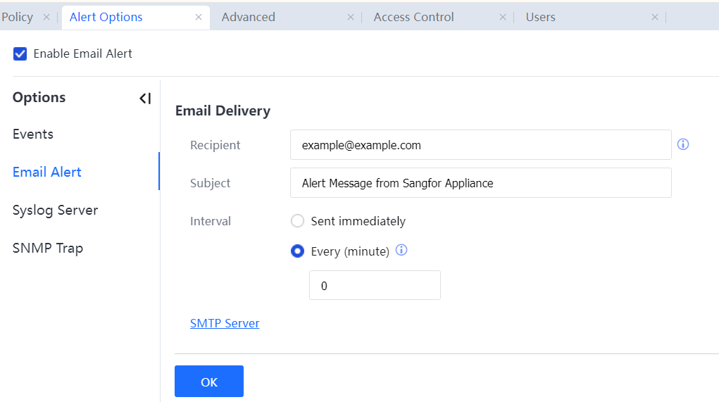 - To set the address of the mail server for sending alarm emails and the recipient mailbox, choose System > General > Alert options > Email Alert[A88] > SMTP Server.