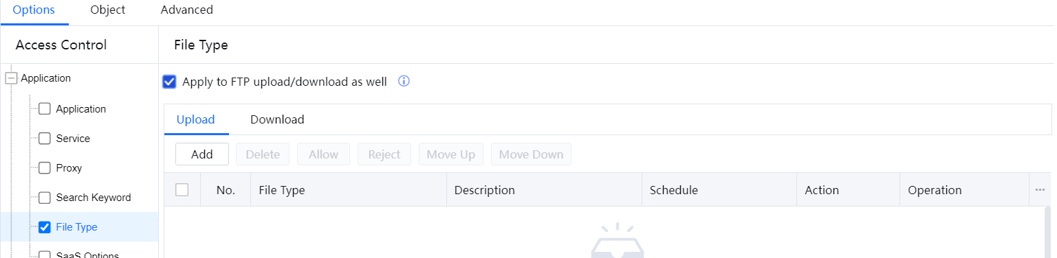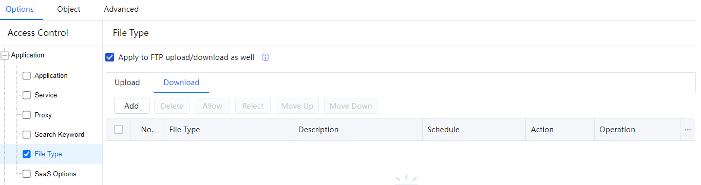 Web file type filtering comprises two parts: uploading and downloading. You can set the IAG to filter files uploaded or downloaded over HTTP or FTP.