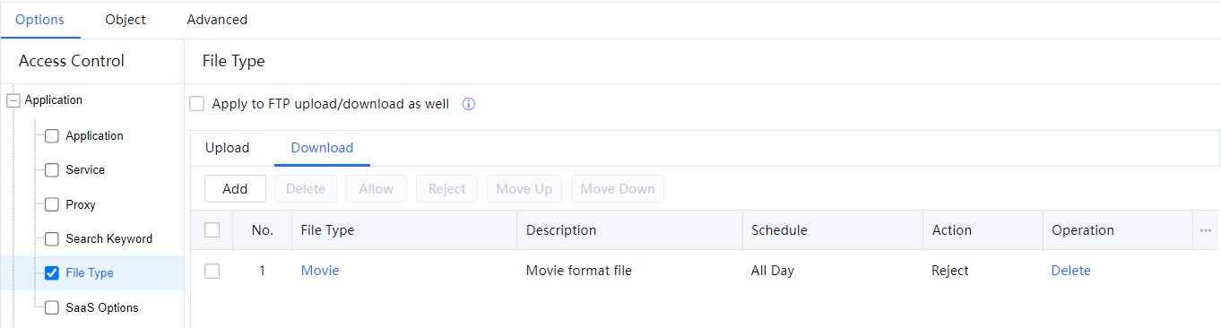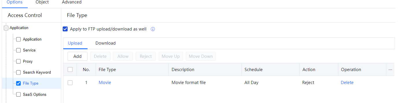 - Return to the configuration page, set Action to Reject and Schedule to All Day, and click OK. The policy of rejecting requests to upload film files to websites or over FTP all day is set successfully.