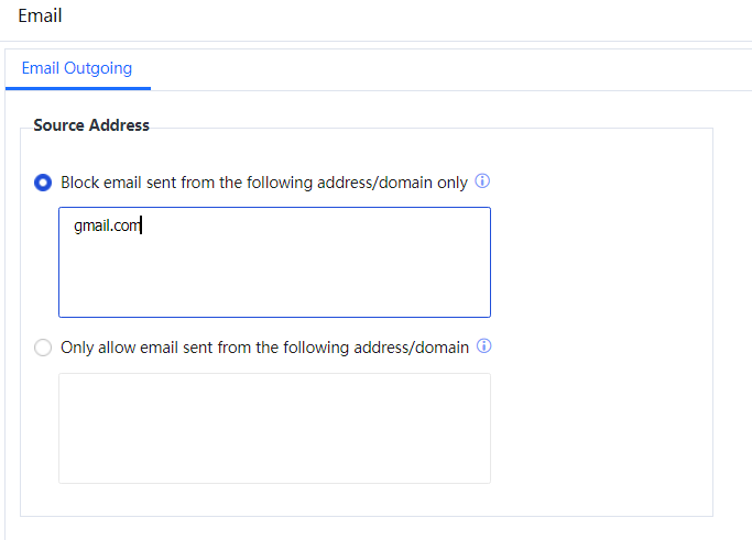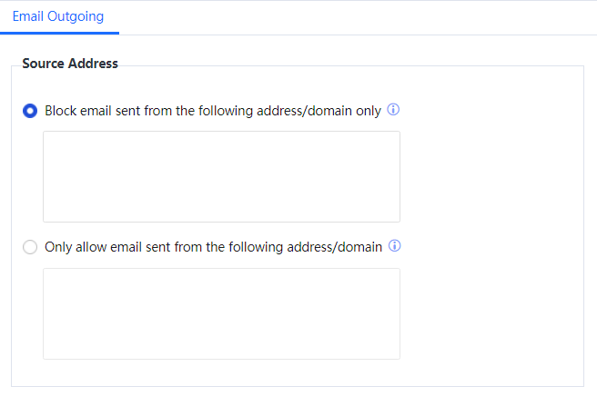 Source Address: to filter sender addresses of mails. Select Block email sent from the following addresses/domain only and enter the mail addresses to be filtered. If the sender of any mail matches any of the listed mail addresses, the IAG blocks the mail. Select Only allow email sent from the following addresses/domain and enter the mail addresses to be allowed. If the sender of any mail matches any of the listed mail addresses, the IAG allows the mail. See the following figure.