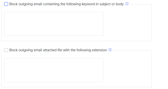 Block outgoing email containing the following keyword in subject or body: If this option is selected, the IAG detects whether the title and text of a mail to be sent contain the specified keywords. If yes, the IAG blocks the mail. For example, to filter mails whose title or text contains the keyword Job Hunting, enter Job Hunting.