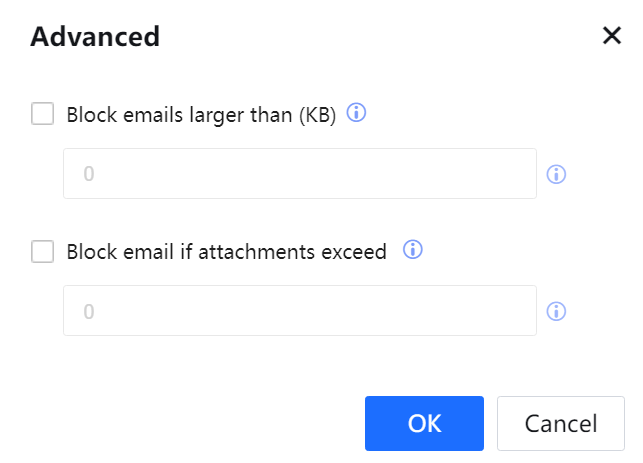 If Block emails larger than (KB) is selected in the Advanced dialog box, and the function of detecting mail size is enabled, the IAG will block emails whose size exceeds the specified value. If Block email if attachments exceed is selected and the function of detecting the number of attachments in emails is enabled, the IAG will block emails whose number of attachments exceeds the specified value.