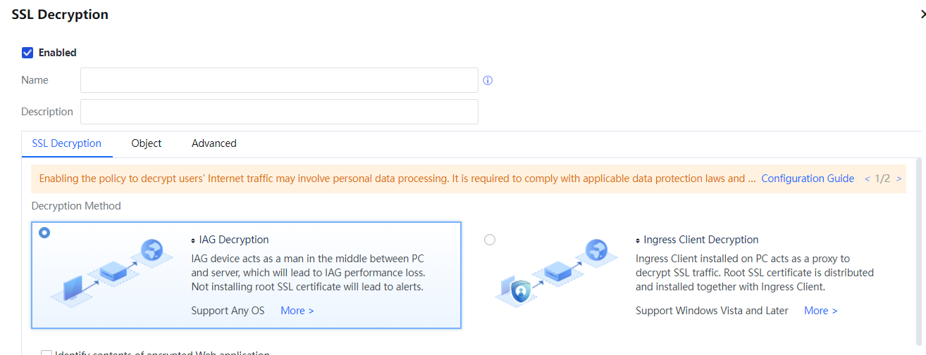 Two decryption methods: IAG decryption and Ingress client decryption. Selecting ingress client decryption requires configuring an ingress policy to take effect.