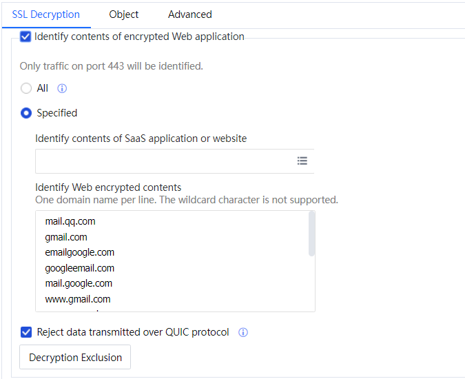 Step 4.Define the decryption range, and select Identify contents of encrypted Web application. You can choose All or Specified; web applications only support identification using port 443.