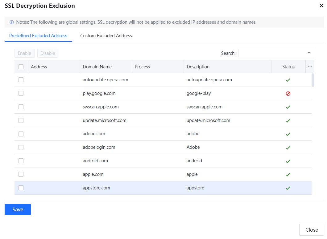 Step 7.Click Decryption Exclusion, configure the IP, domain name, and process that do not require SSL content identification. The three are related to each other and can be used flexibly.
