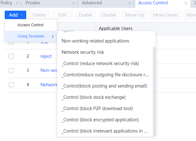 You can use an available policy or a built-in policy as a template to add a policy. If a policy is added using a template, the settings for the template are applied to the new policy. It facilitates the addition of multiple Internet access policies that are identical to or similar to each other.
