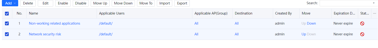 You can move policies in a list using two methods: 1. Select the policy, and click or . 2. Click in the Move column in the policy records.