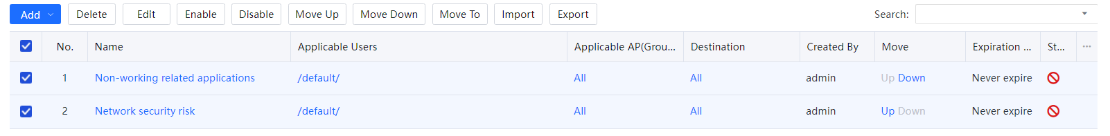 This function is used to import or export a policy. When necessary, you can import a policy into the system. If multiple devices have the same version and the same policy must be applied, you can create the policy and import it into the devices so that repeated configuration is not required.