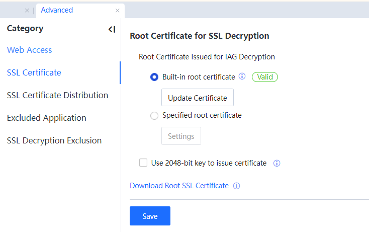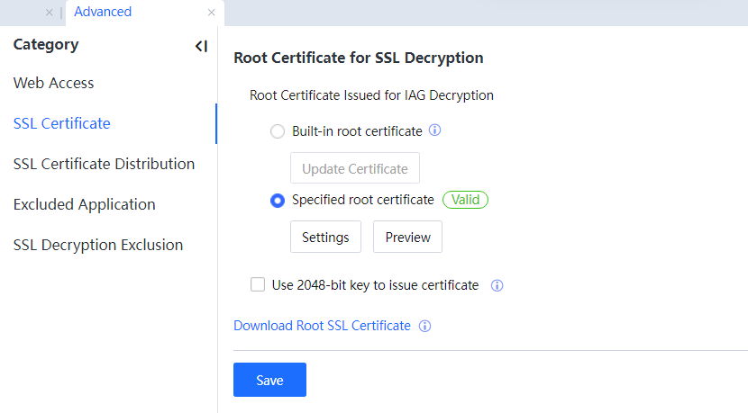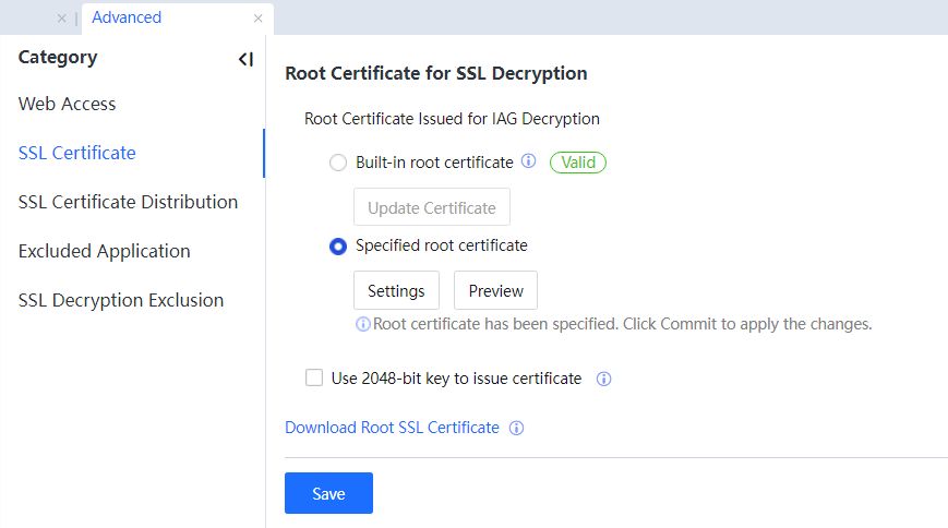 Navigate to Online Activities > Advanced > SSL Certificate to select the Specified root certificate. Click the Settings button to configure the specified root certificate.