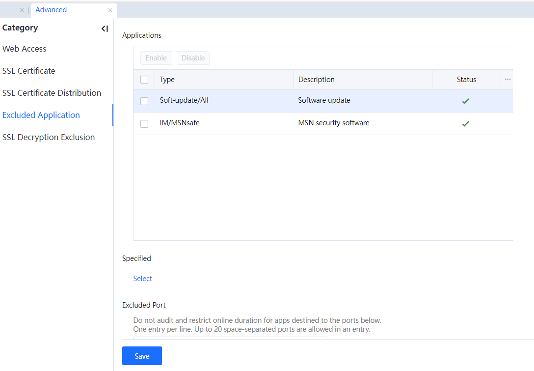 Specified: It allows users to specify the applications to be excluded from statistics and Internet access control. Click Select and select the applications to be excluded. If an application to be excluded is not listed, you can choose System > Objects > Custom Application, define the application, and select the application in this list.[LCH98][A99]