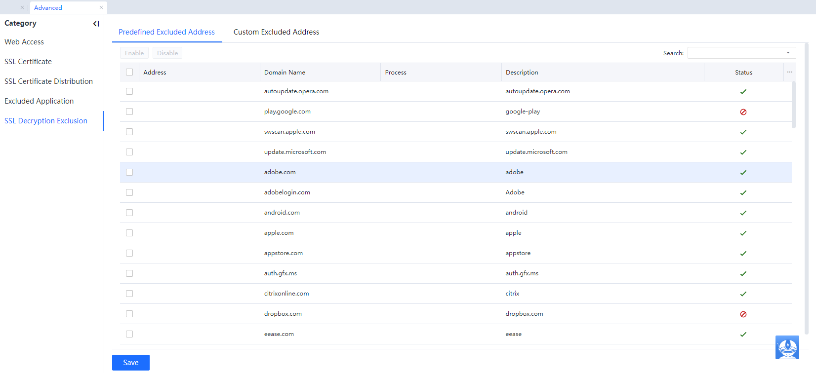 The domain name in the exclusion list will not be used to decrypt SSL contents.