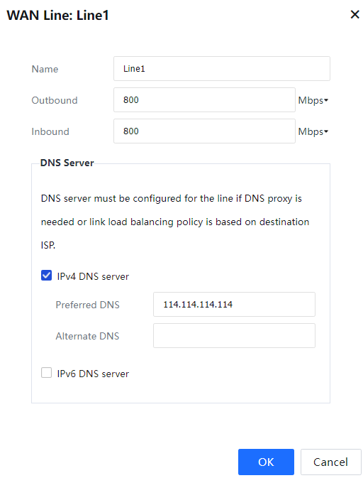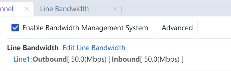 Step 1.Choose Bandwidth Management > Edit Line Bandwidth and configure Internet line bandwidth. Click Line 1 to view the Edit Virtual Line window. In this example, the company leases a 10 Mbps line; therefore, the values of Outbound and Inbound are set to 800 Mbit/s[LCH100][A101].