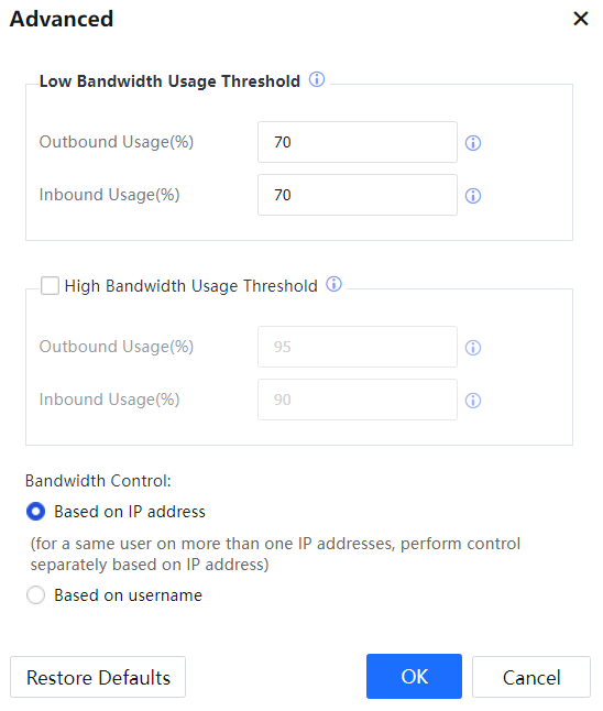 Click Advanced, set the Low Bandwidth Usage Threshold, and whether to enable the High Bandwidth Usage Threshold. See the following figure.