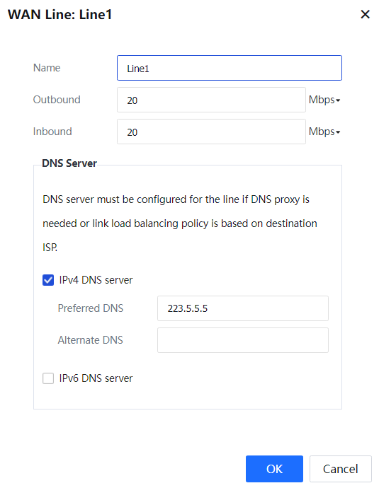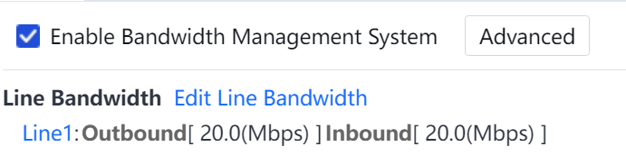Step 1.Enter Bandwidth Management > Edit Line Bandwidth. Set Outbound and Inbound to 20Mbps.