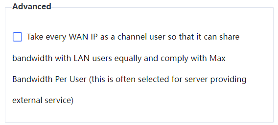 Advanced: Take every WAN IP as a channel user so that it can share bandwidth with LAN users equally and comply with Max Bandwidth Per User (this is often selected for a server providing external service)
