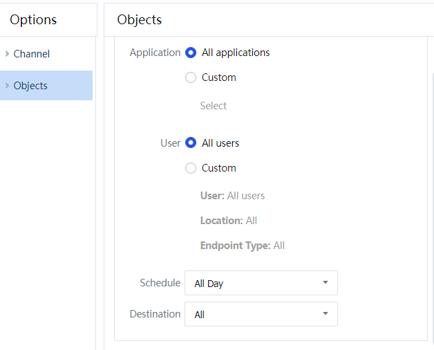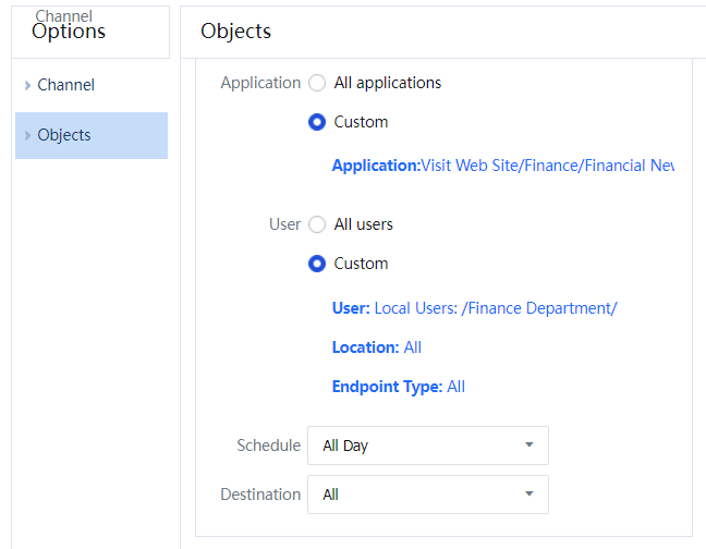 Step 8.Configure the Destination of the strategy, which can be used in conjunction with the Users in the Objects above. In this case, the channel has been set in Applicable Users to be effective for financial personnel so that you can define Destination as All.