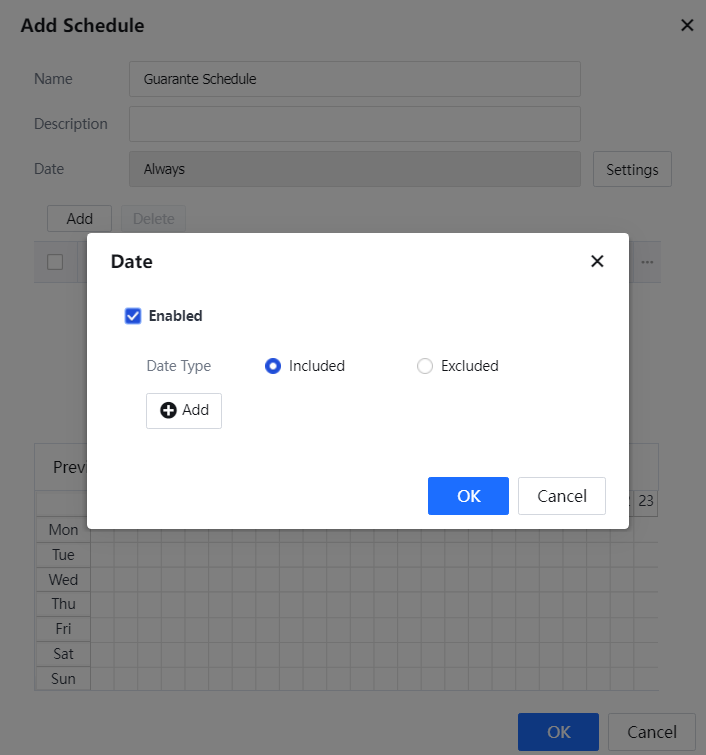 Step 7.If the effective channel date is preset, click the Setting button behind the Date column to add or exclude a period. After setting, click the OK button, and finally click OK[A105].