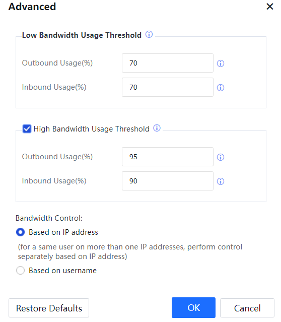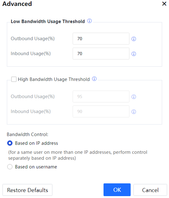 Click Advanced, set the Low Bandwidth Usage Threshold, and specify whether to enable a High Bandwidth Usage Threshold. See the following figure.