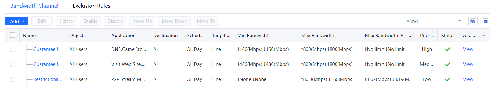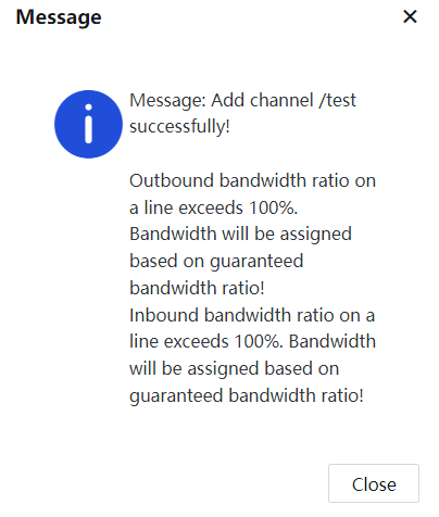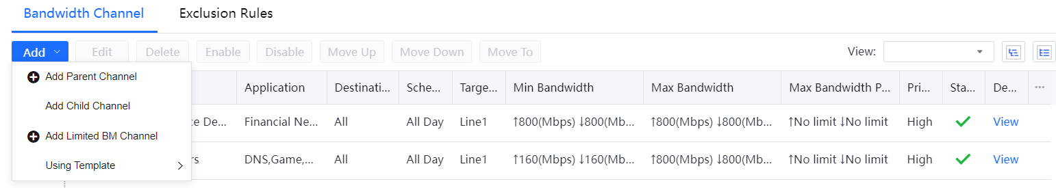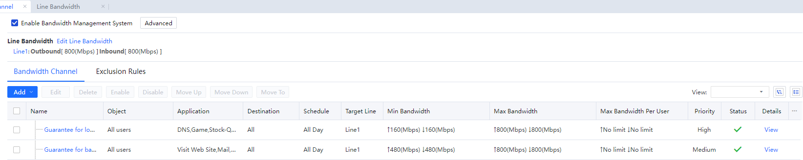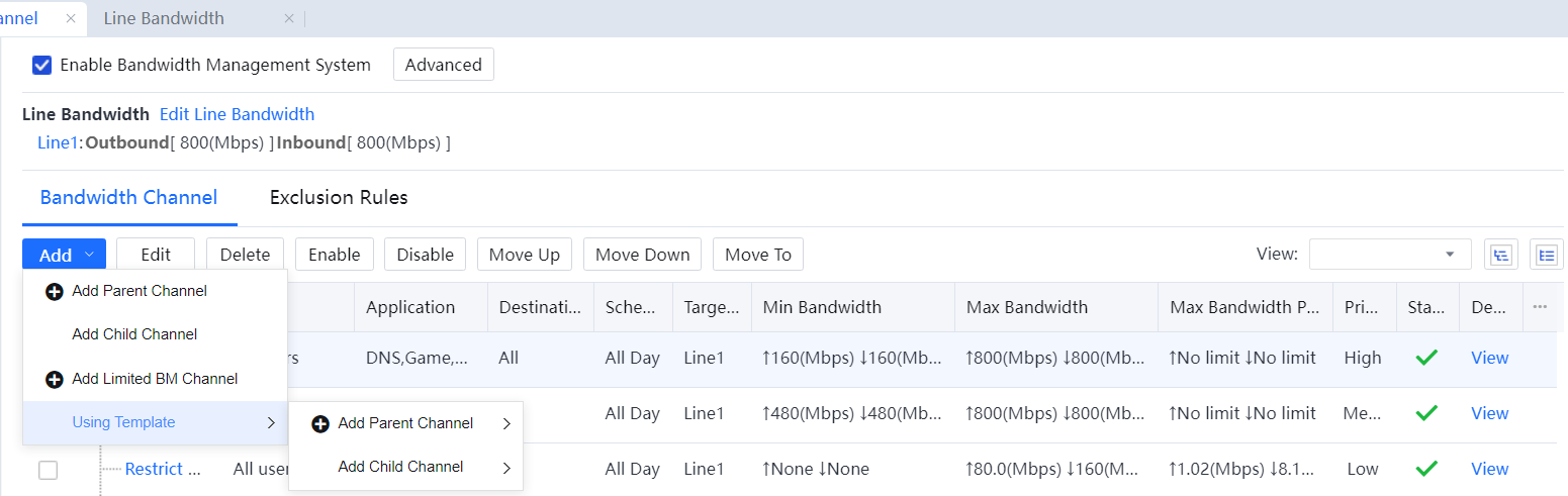Bandwidth Channel Settings: It sets the effective line, channel type, limited or assured bandwidth, and per-user bandwidth.