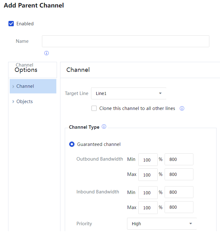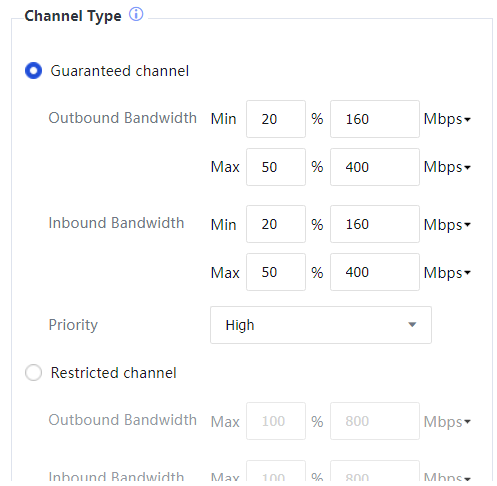 Channel Type: To select a channel type and set bandwidth thresholds. In this example, the finance department personnel must be allocated 160 to 400 Mbps bandwidth to access online banking websites and send and receive emails. Therefore, select Guaranteed Channel and set minimum and maximum Outbound Bandwidth and Inbound Bandwidth to 20% and 50% of the total bandwidth. The total bandwidth is 800 Mbps; therefore, the assured bandwidth is 160 Mbps, while the maximum bandwidth is 400 Mbps. Priority includes High, Medium, and Low, which indicate the priority of allocating bandwidth of other channels to this channel when the other channels are idle.