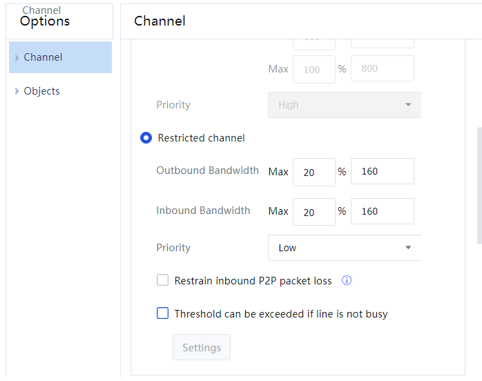 Channel Type: To select a channel type and set bandwidth thresholds. In this example, the bandwidth for P2P data downloads performed by marketing personnel is limited. Select Limitation Channel and set Outbound Bandwidth and Inbound Bandwidth to 20% of the total bandwidth each. The total bandwidth is 800 Mbps; therefore, the limited bandwidth is 160 Mbps. Priority includes High, Medium, and Low, which indicate the priority of bandwidth allocation to the channel during peak traffic hours.